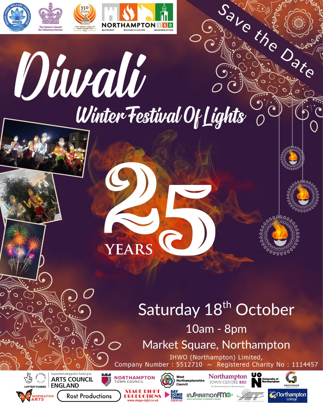 This years is the 25th Anniversary of The Diwali Winter Festival of Lights in Northampton, organised by the Indian Hindu Welfare Organisation Northampton, and supported by Northampton Town Council, West Northamptonshire Council, Northampton Town Centre BID, Inspiration Arts, Rost Productions Ltd, Inspiration FM, University of Northampton, Northampton College and Grosvenor Shopping Centre. The event is supported using public funding by the National Lottery through Arts Council England.