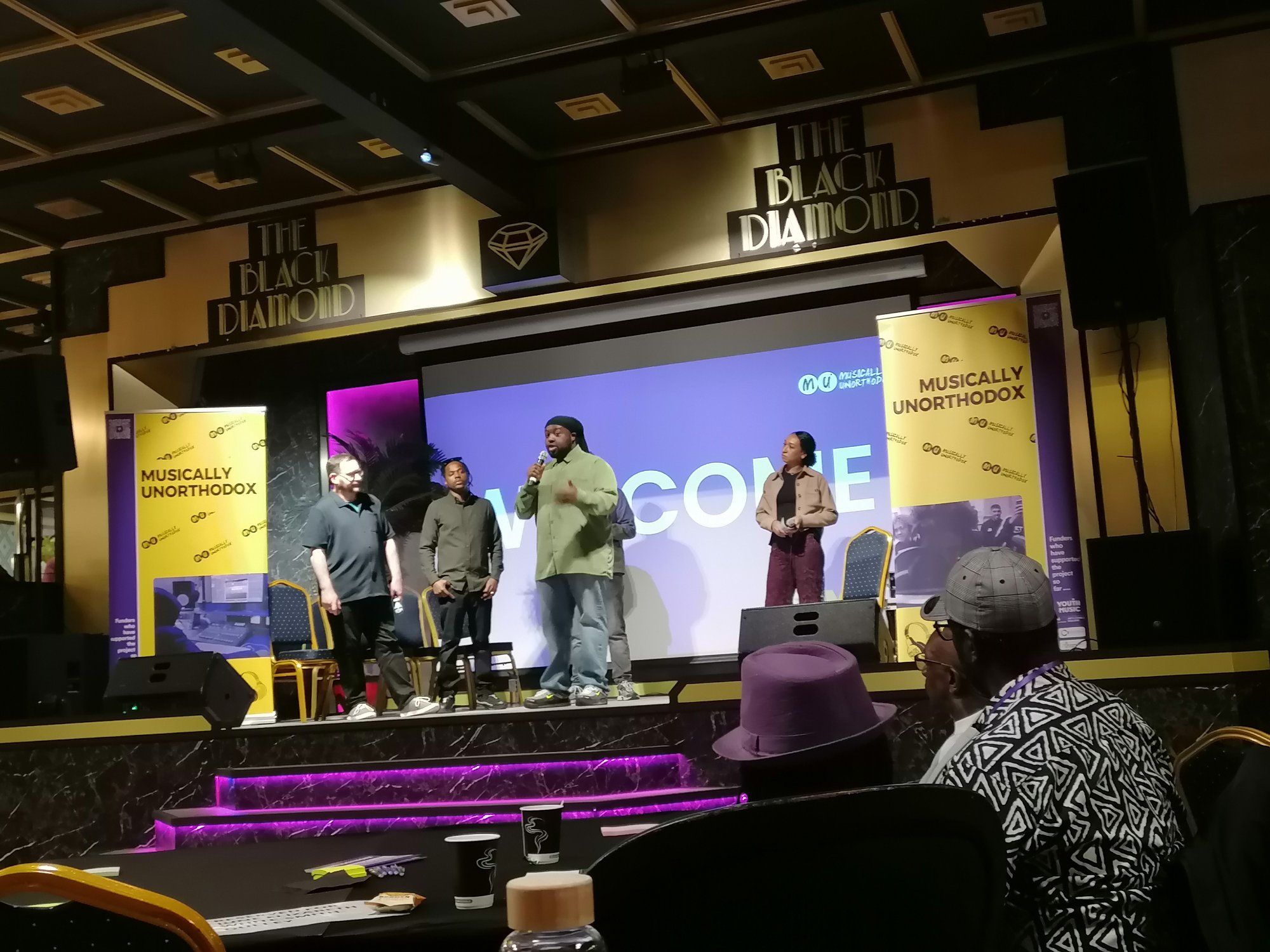 A panel of people speak at a music conference in Northampton.