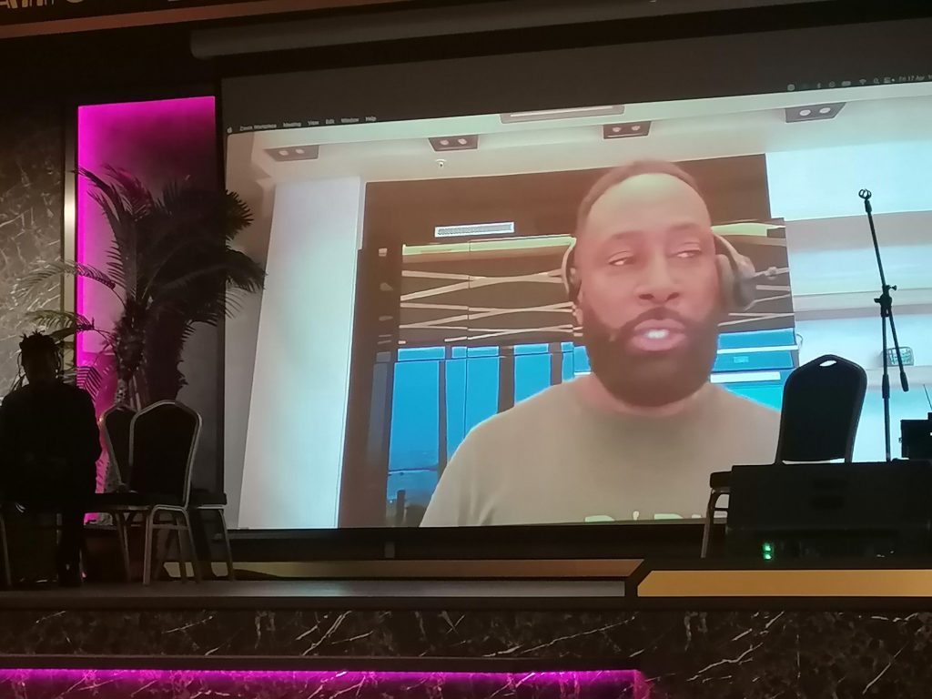 Quinto Green and two other men talk at a recent music conference.