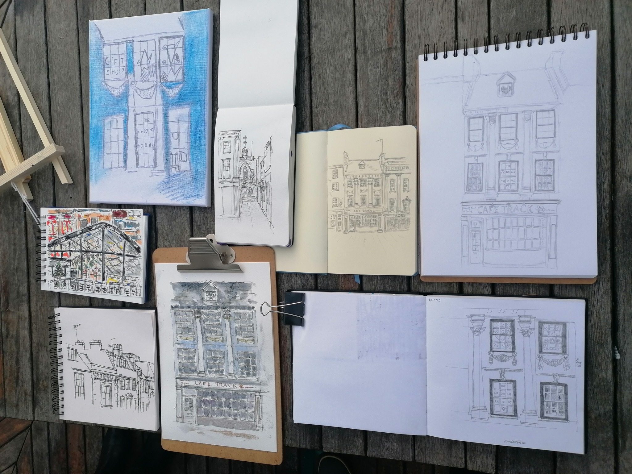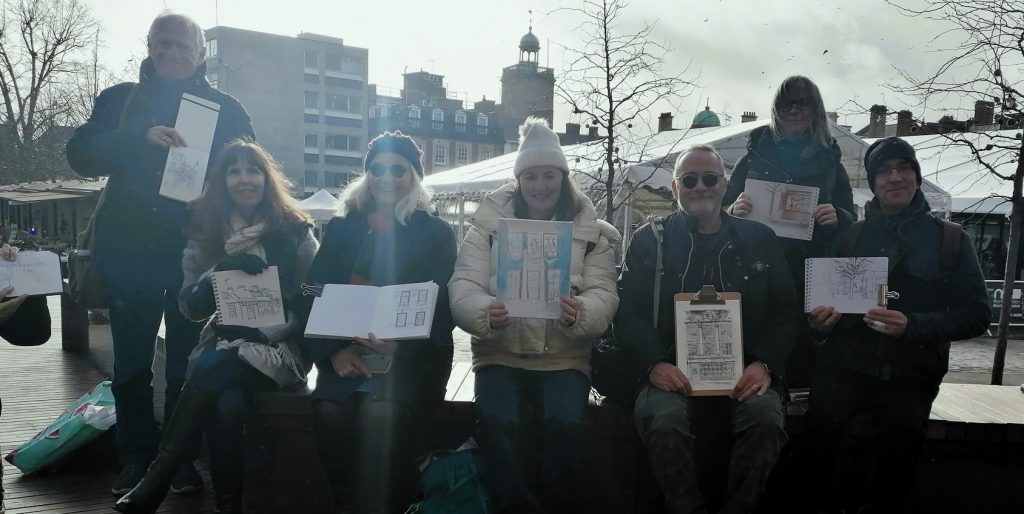 Everyone meets in one place, then drifts off in twos and threes to find a view that catches their eye. You sketch for around an hour, then reconvene to share what you’ve produced.