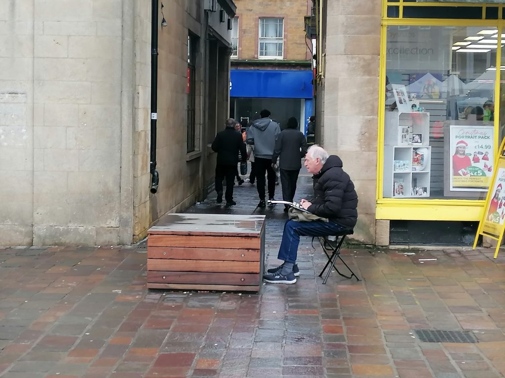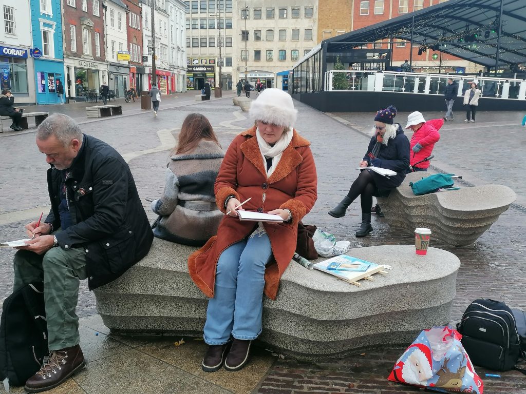 When I gatecrashed Northampton Urbansketchers on a brisk Saturday morning in December, I wasn’t entirely convinced it was even going to go ahead. The forecast looked unpredictable, threatening rain – and this gathering was taking place in the Market Square.