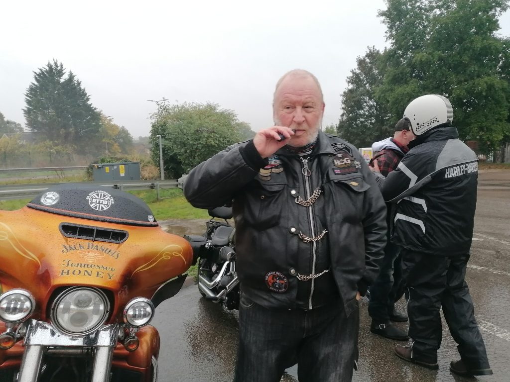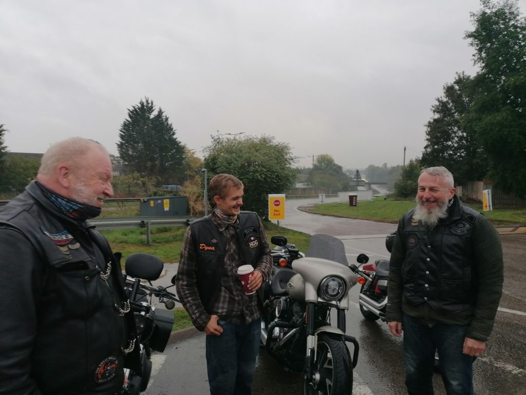 Simon led our Northampton riders out in the morning drizzle to Brampton Hut Services. By the time we rolled in, the car park looked like a Harley convention – 52 gleaming bikes lined up like chrome soldiers. And their riders? A leather-clad sea of patches, badges and smiles.