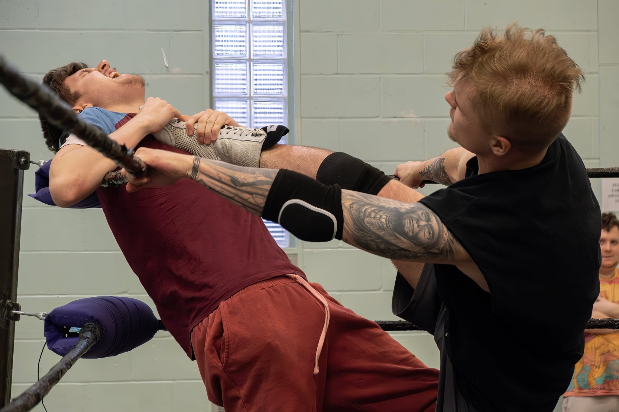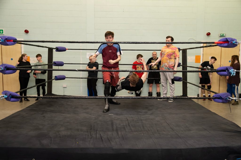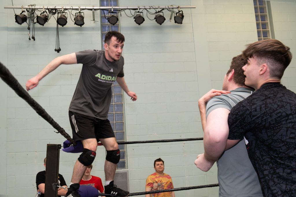 Here, performance gave way to process. Beginners practised basic moves—learning how to fall, or “take a bump,” safely—while more experienced wrestlers refined sequences and timing. I watched one young lad take his very first bump, hesitant but determined. Around him, others offered encouragement, advice, and reassurance.